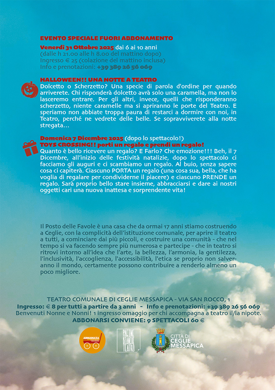 Il Posto delle Favole è una casa che da ormai 17 anni stiamo costruendo a Ceglie, con la complicità dell’istituzione comunale, per aprire il teatro a tutti, a cominciare dai più piccoli, e costruire una comunità – che nel tempo si va facendo sempre più numerosa e partecipe – che in teatro si ritrovi intorno all’idea che l’arte, la bellezza, l’armonia, la gentilezza, l’inclusività, l’accoglienza, l’accessibilità, l’etica se proprio non salveranno il mondo, certamente possono contribuire a renderlo almeno un poco migliore.